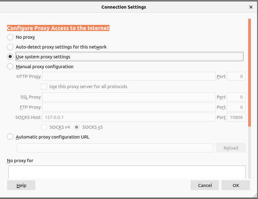 修改火狐浏览器的代理设置:“设置(齿轮按钮)”-“General”-“Network Settings”-“Configure Proxy Access to the Internet”,设置为